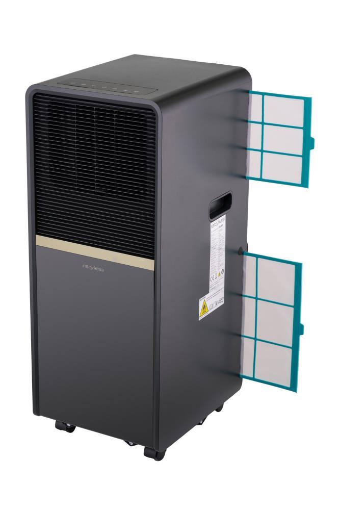When temperatures in your home become almost unbearable, you urgently need to cool down. The Polarix air conditioner, with 9,000 BTU, offers a quick and flexible solution! Its low energy consumption (energy class A), a 24-hour timer, and a remote control are just some of the features that set it apart, as are additional fan and dehumidification modes. Thanks to its casters, the Polarix can be used immediately anywhere cooling is needed. Also significant is its Swiss-designed design, which exudes style and sophistication with elegant anthracite and luxurious gold.
