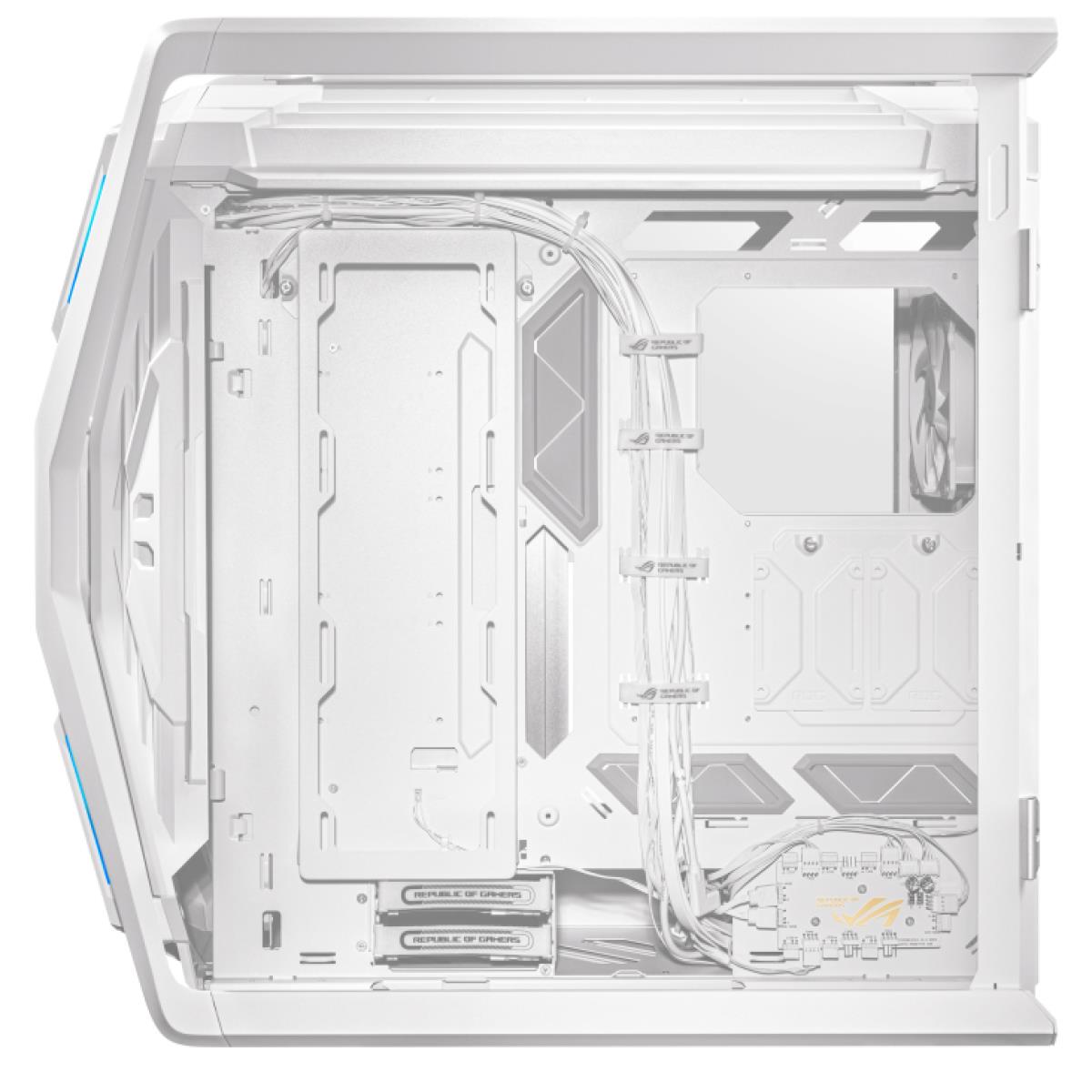 ROG Hyperion GR701 E-ATX computer case, 420 mm dual radiator support, four 140 mm fans, metal GPU holder, component storage, ARGB fan hub, 60W fast charging.