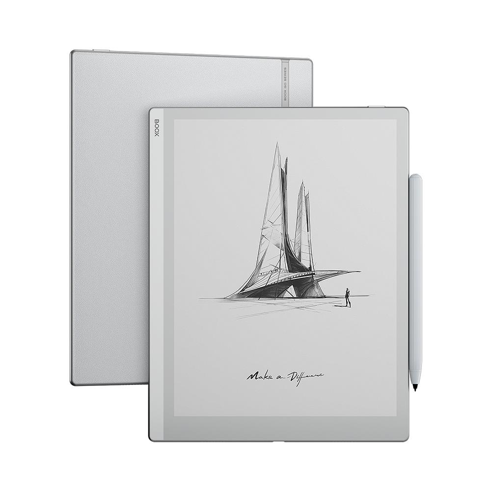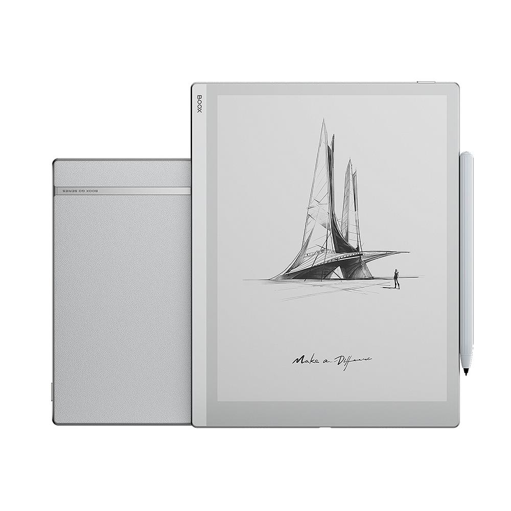 ONYX BOOX Go 10.3 is a large-format 10.3” E Reader that allows you to take handwritten notes with a pen coming with the device. The model is equipped with a high-resolution E Ink Carta Plus (Carta 1200) screen with two sensor layers: a capacitive layer for finger touch and an inductive layer for working with a pen. The device is based on a high-performance hardware platform and a lightweight thin body (4.5 mm). The ONYX BOOX Go 10.3 runs on an 8-core processor and 4 GB of RAM, and 64 GB of non-volatile storage will be enough to store a large number of ebooks and documents. The built-in dual-band Wi-Fi module allows you to access the Internet and use network services, and Bluetooth 5.0 support allows you to connect external devices and accessories. With the help of the pre-installed audio player, you can listen to the music and audiobooks. The Text-To-Speech function is also supported. The model runs on the Android 12 operating system and allows you to install and use third-party applications. The device has the Google Play app store for downloading and installing different third-party applications. The screen is covered with a special ONYX Glass protecting it from damages. Thanks to its large screen and possibility to make handwritten notes, the model will be an excellent choice for those who plan to work with documents and to write a lot. The ONYX BOOX Go 10.3 has no front light system and has been designed for working in external lighting.
