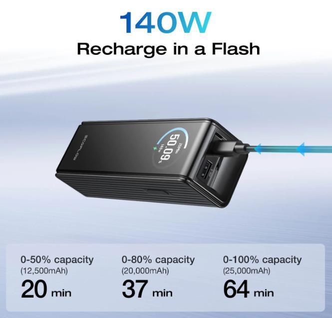 140W Max Input Power: The power bank can be recharged from 0% to 50% capacity in approx. 20 minutes.