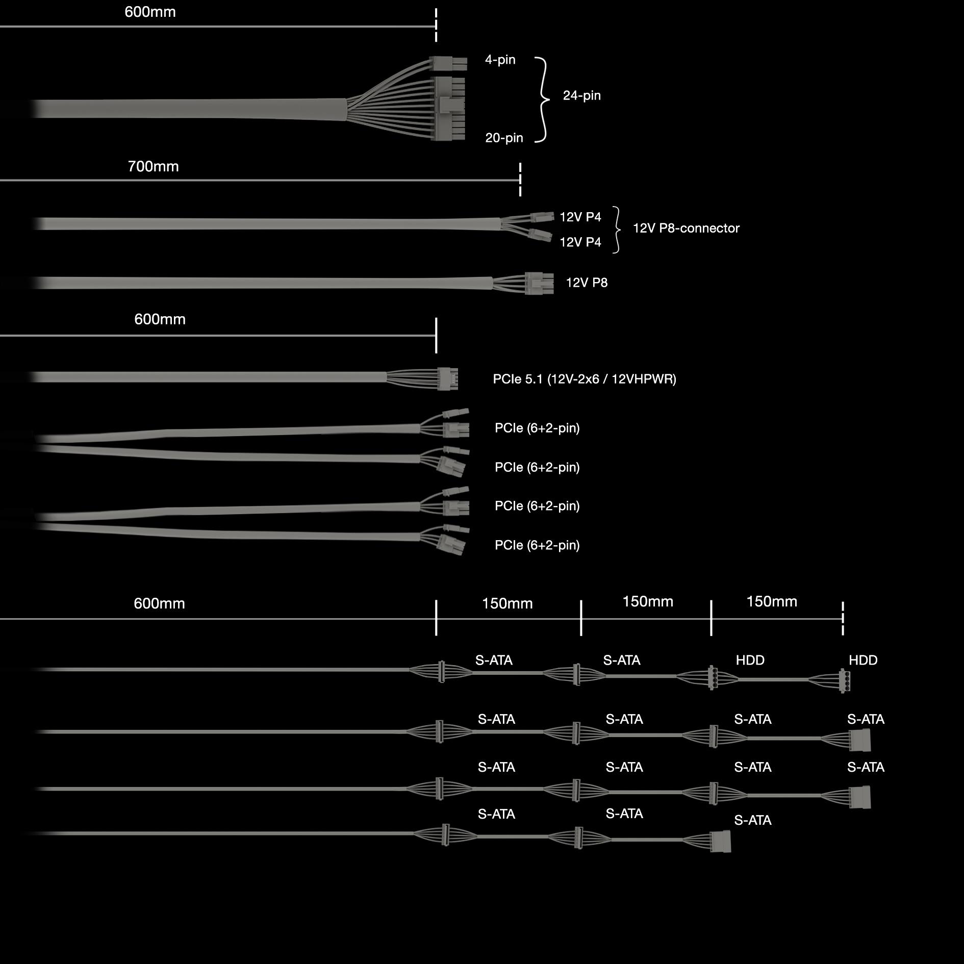 Summary: be quiet! Dark Power 14 850 W – 80 Plus Titanium. Total power: 850 W, AC input voltage: 100 – 240 V, Peak power: 950 W. Motherboard power connector: 20+4 pin ATX, Motherboard power cable length: 60 cm, SATA power cable length: 600,750,900,1050 mm. Purpose: PC, Power supply unit (PSU) form factor: ATX, 80 PLUS certification: 80 PLUS Titanium. Product colour: Black, Cooling type: Active, Fan diameter: 13.5 cm. Compliance certificates: CB, Federal Communications Commission (FCC), RoHS, TÜV mark, UKCA, WEEE, cTUVus